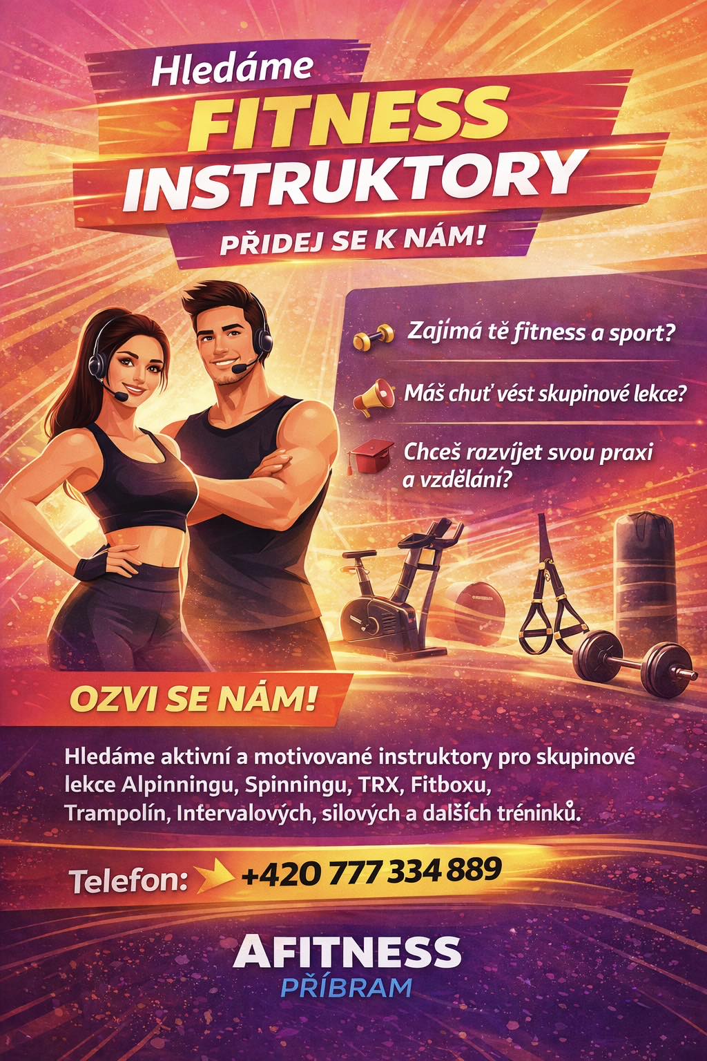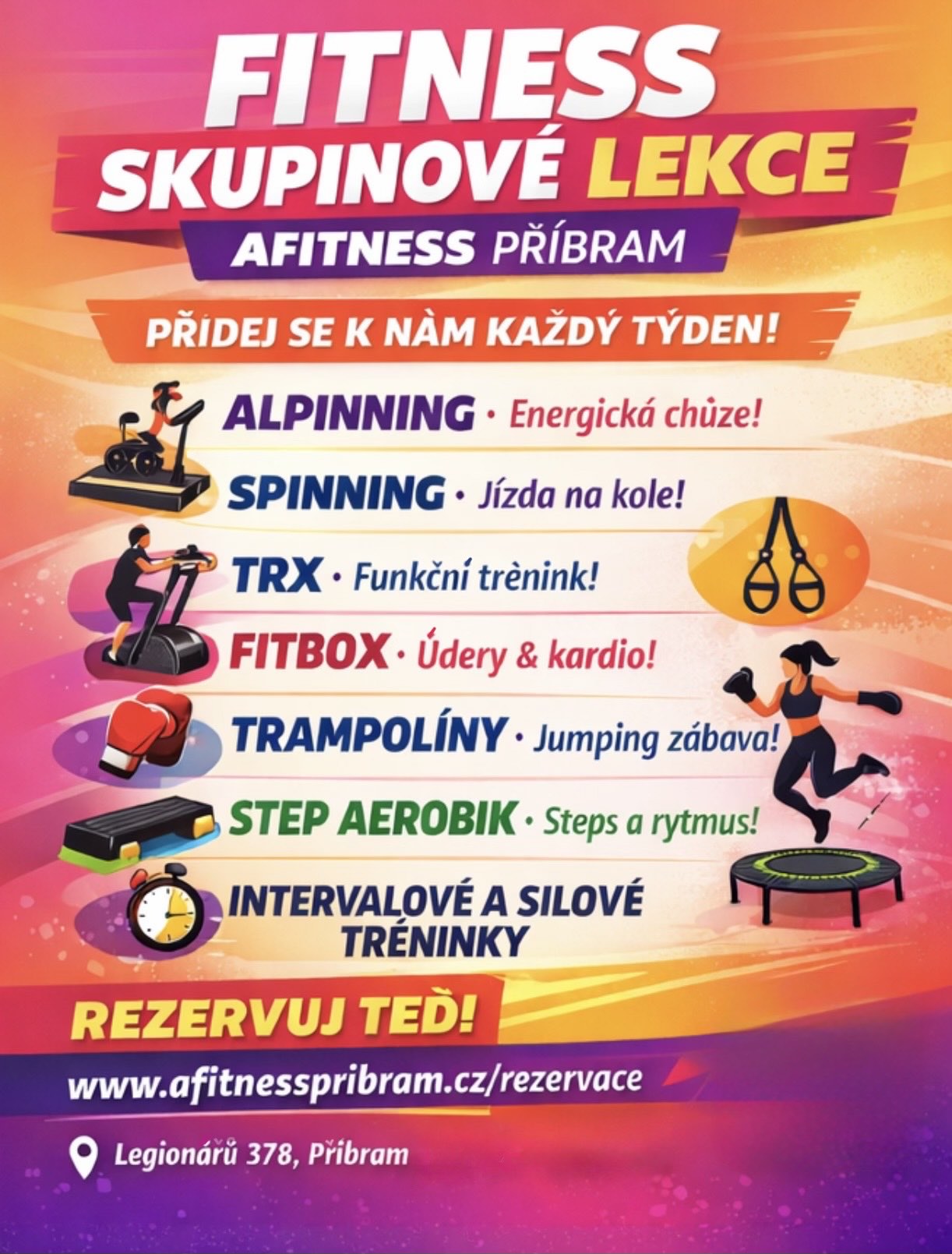V Afitness Příbram Vás čeká energie, radost z pohybu a podpora trenérů, kteří Vás provedou každým tréninkem. Přijďte si zacvičit, vypnout hlavu a udělat něco pro sebe.